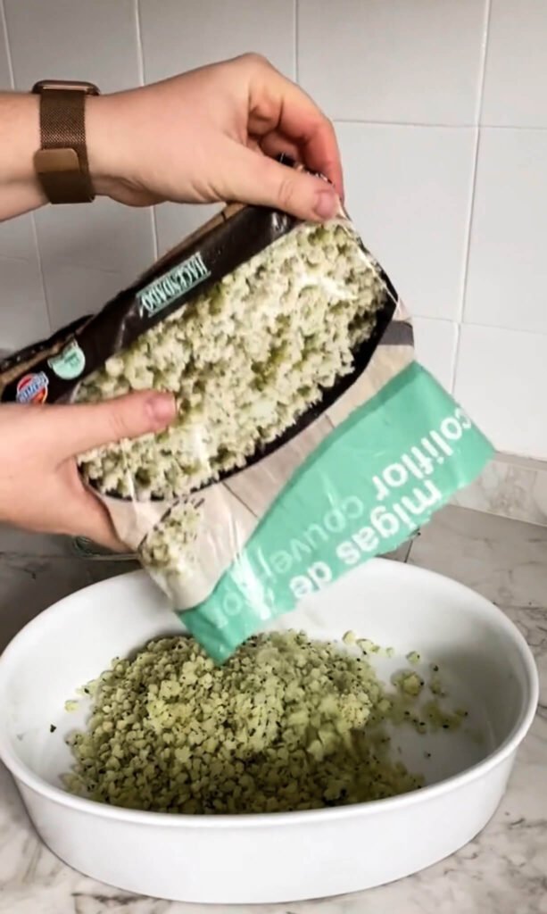 • 450 g de coliflor en “migas”.La del Mercadona funciona genial; si la haces en casa, solo ralla la coliflor o pásala por procesador.