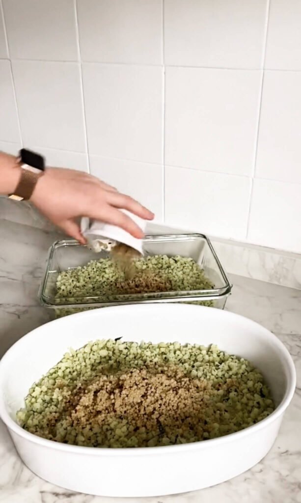 • Mezcla la coliflor y la quinoa en una fuente de horno grande o dos pequeñas.