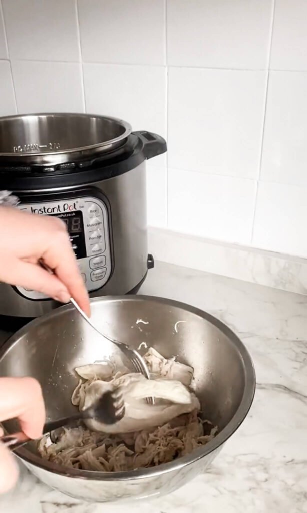 Comenzamos preparando el pollo. Si usas pechugas, puedes cocinarlas con caldo en la olla a presión; en unos 8–10 minutos estarán listas. También puedes hacerlo en una olla normal, simplemente tardará más. Cuando esté cocido, lo mechamos: puedes usar dos tenedores o una batidora de varillas, que lo hace rapidísimo.