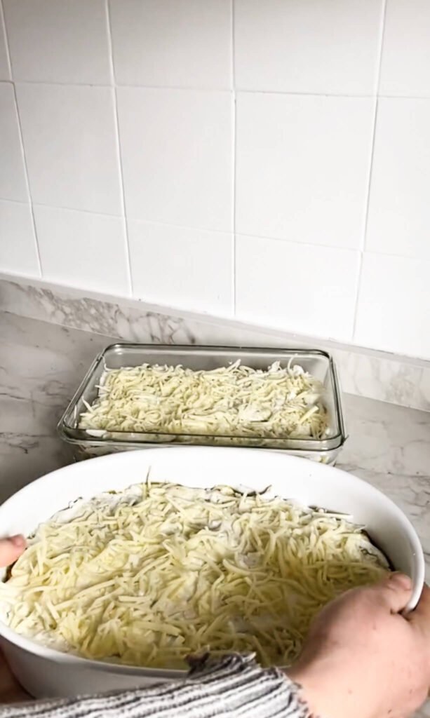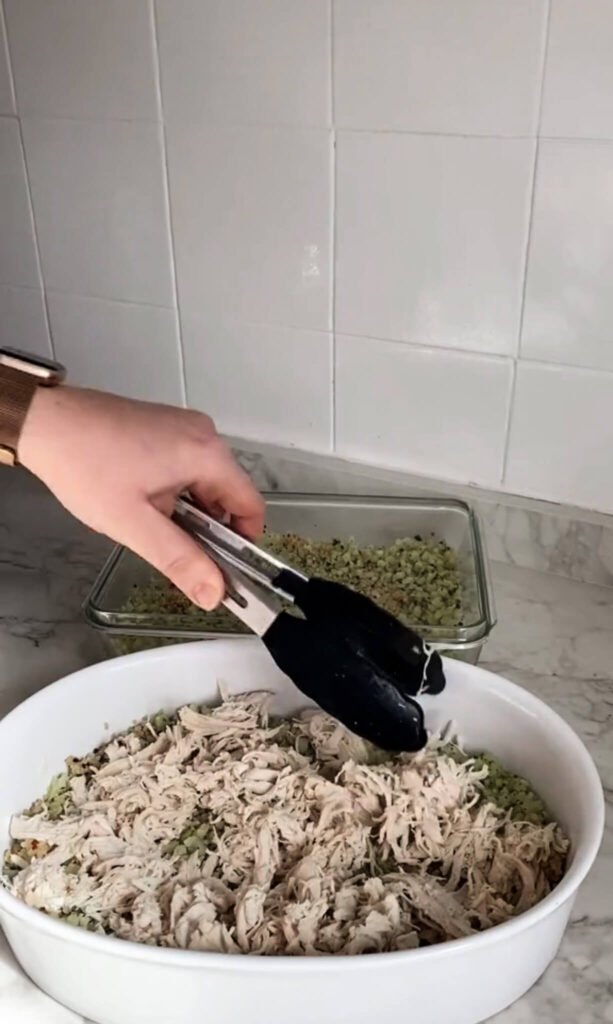En una fuente de horno amplia mezclamos las migas de coliflor con la quinoa cocida. No hace falta cocinar la coliflor previamente: se hará en el horno y queda perfecta (en mi caso uso la congelada de Mercadona y la agrego sin descongelar). Cuando esté todo integrado, añadimos el pollo mechado en una capa, la salsa verde en otra capa y la mezcla de quesos que esparcemos por encima con cuidado para finalmente cubrir con mozzarella rallada.