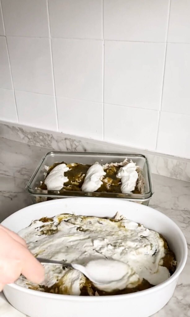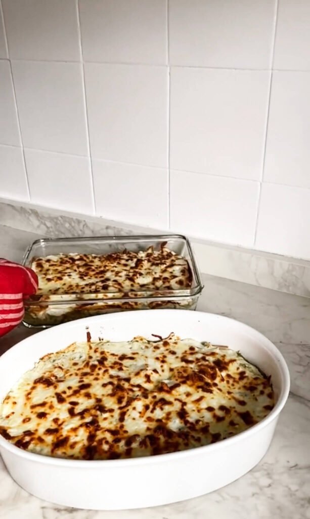 Plato bajo en carbohidratos hecho con coliflor, quinoa opcional y pollo mechado. Se mezcla con salsa verde y una crema de ricotta + cottage, se cubre con mozzarella y se hornea. Perfecto para meal prep y congela genial.